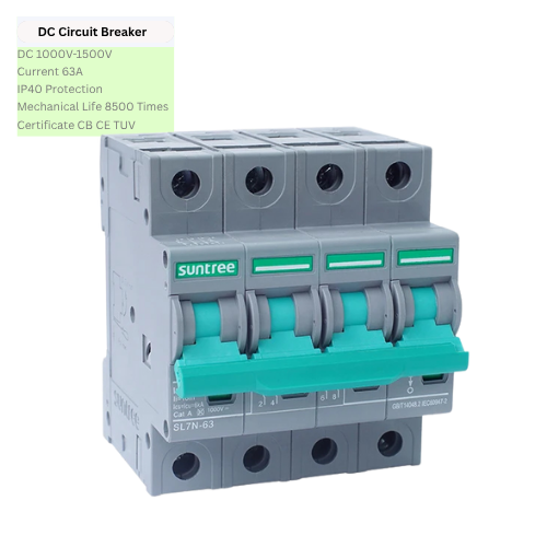 Ensure maximum safety for your solar power system with the Suntree 4P DC Circuit Breaker—engineered for high-voltage DC applications ranging from 1000V to 1500V. Built for durability and precision, this 63A circuit breaker offers advanced protection against overcurrent and short circuits in both off-grid and grid-tied solar installations.